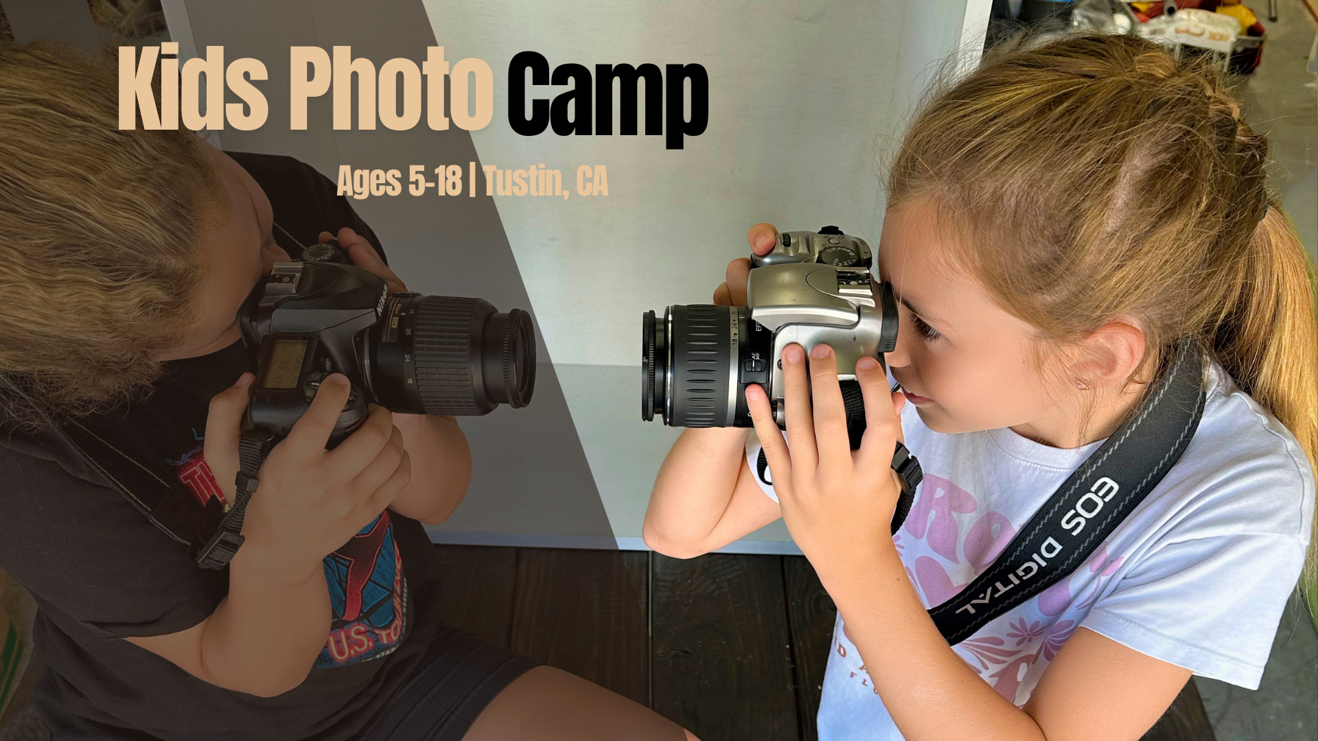 Kids Photo Camp in Tustin, California is a hands-on summer photography camp for ages 5–18. Campers learn how to shoot in manual mode, work with studio and natural light, capture action outdoors, and create real projects including printed self-portraits.
