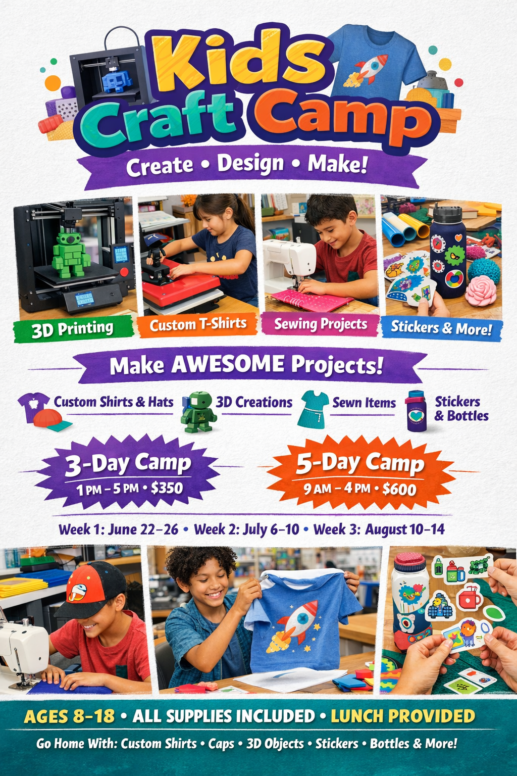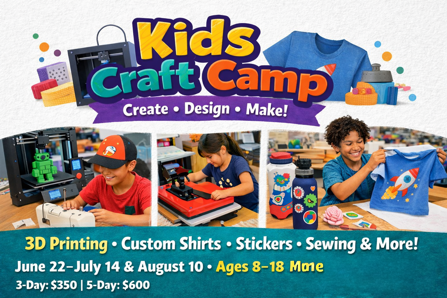 This is not a typical craft camp. Students will work with real tools and creative technology including 3D printing, sewing machines, heat presses, and digital design software.